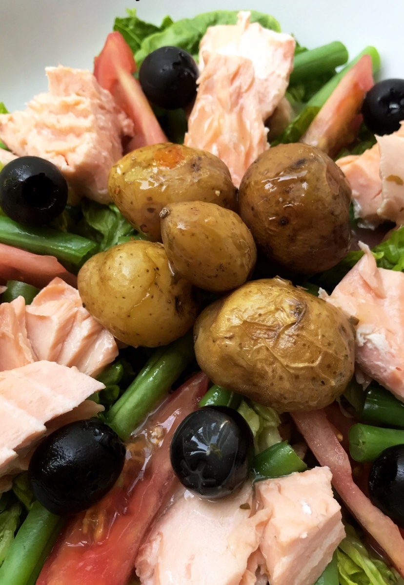 Remove salmon from water and allow it to cool. Meanwhile, pile greens onto a dinner plate and top with potato, green beans, tomato and olives. Lay salmon on top of the salad and dress with salad dressing if you’d like. This salad makes either a wonderful main or a lovely side to a summer BBQ. It can also be used as a meal prep dish if one wishes to prepare several meals in advance.