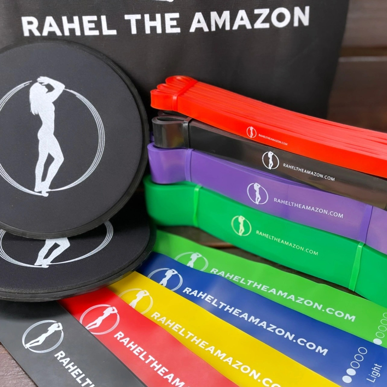 A bundle consisting of Glute Bands, Core Sliders and a full set of Latex Resistance Bands (in a branded drawstring bag). Comes with a complimentary tote bag for you to keep your equipment in.